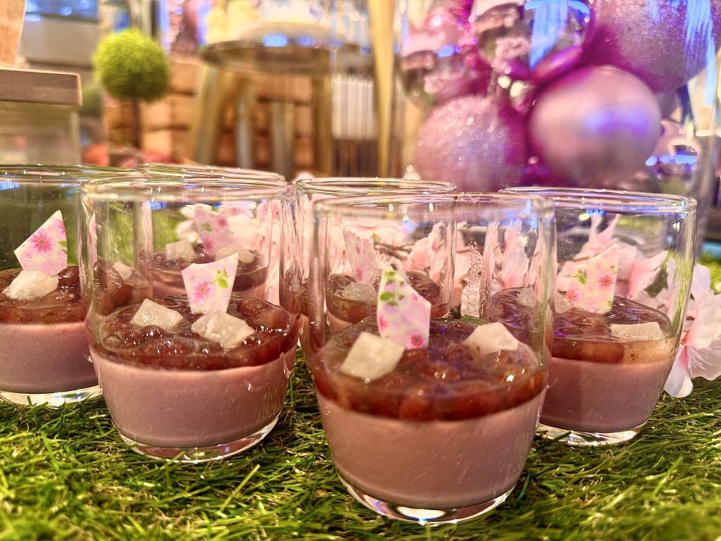 上には桜葉を加えた洋風ぜんざいを重ね、もっちりとした小さなわらび餅をアクセントに添えました。和と洋が重なり合う、春らしい一品です。