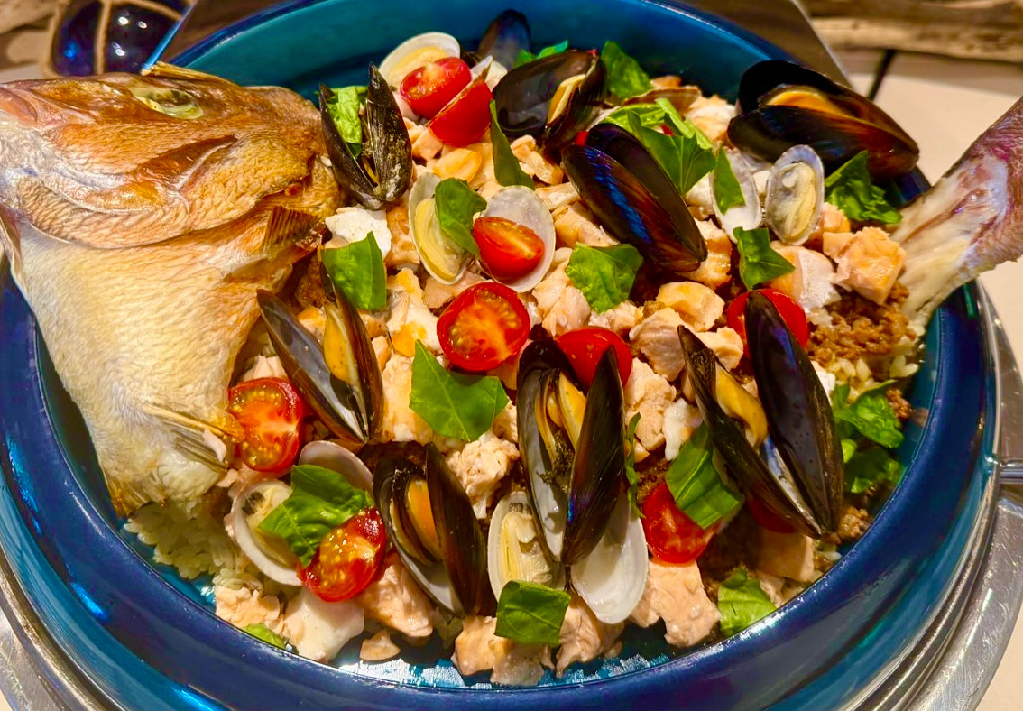 - レストランご夕食にて、夏の新メニューを1品ご紹介いたします。 【魚介たっぷりパエリア〜ガパオ仕立て〜】 スペイン料理とタイ料理をフュージョンした一品。 地元白浜産の真鯛をまるまる一尾使用。 ムール貝やアサリなど、魚介本来 […]